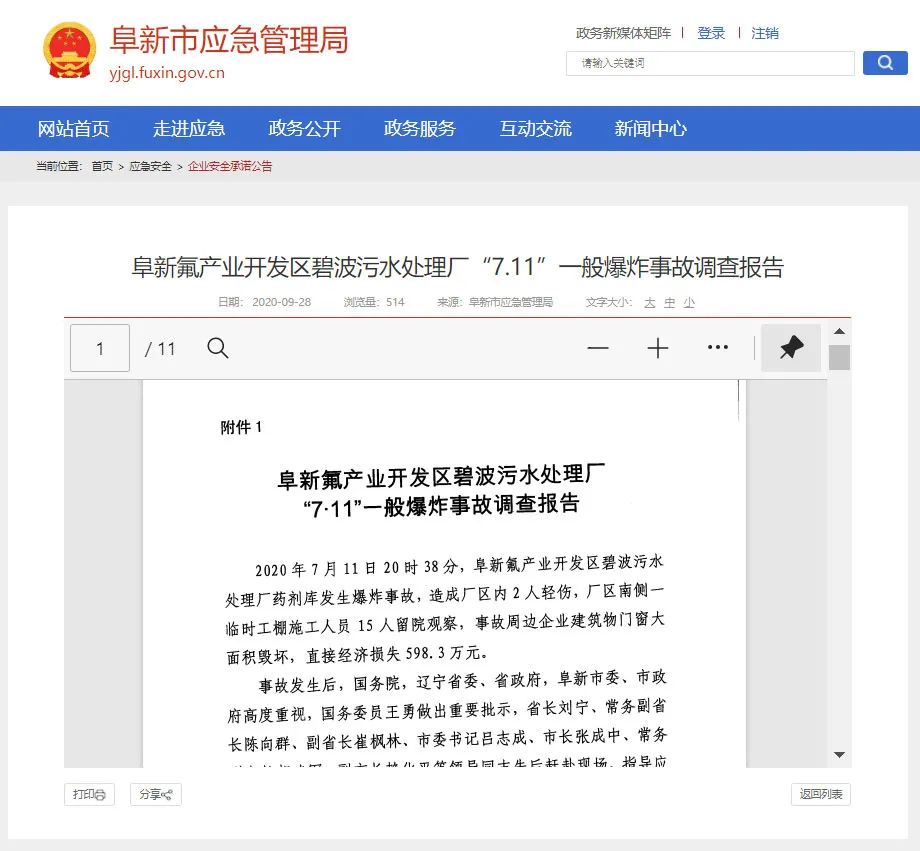 文章導(dǎo)讀近日,阜新市應(yīng)急管理局已經(jīng)發(fā)布了《阜新氟產(chǎn)業(yè)開(kāi)發(fā)區(qū)碧波污水處理廠“7.11”一般爆炸事故調(diào)查報(bào)告》(下稱《報(bào)告》)。結(jié)果顯示,爆炸的直接原因是該污水廠違規(guī)使用氯酸鈉催化劑,在儲(chǔ)存時(shí)與赤砂糖發(fā)生化學(xué)反應(yīng)發(fā)生爆炸,爆炸現(xiàn)場(chǎng)形成的沖擊波相當(dāng)1.0-1.5tTNT當(dāng)量。還記得去年7月12日,遼寧省阜...