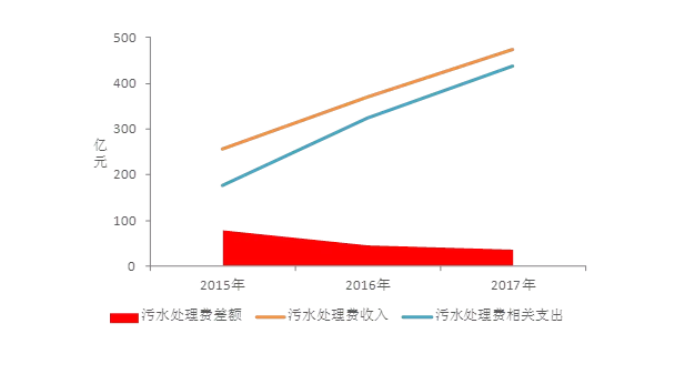 市政污水市場化進程中,城市縣城污水處理設(shè)施建設(shè)不斷趨于飽和,且污水處理費與自來水費被綁定一起進行收繳,污水處理費相對穩(wěn)定可控,從國家層面看,三年以來全國污水處理費收入一直大于支出,而兩者差額在逐漸減少。