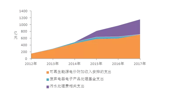 從2012年至2015年,可再生能源支出攀升速度較快,而從2015年至2017年每年該項支出逐漸穩(wěn)定。廢棄電器電子產(chǎn)品支出從2012年至2015年穩(wěn)步提高,而從2016年開始逐漸下降,2017年更是迅速衰減。而全國污水處理費從2015年明確列支開始,即呈現(xiàn)穩(wěn)步增加趨勢。