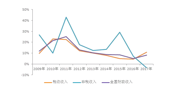 除此之外,全國歷年公共預(yù)算收入增長速度與稅收收入增長速度呈完全正相關(guān)關(guān)系,而非稅收入增長幅度的劇烈波動則會使得這種正相關(guān)關(guān)系發(fā)生一定程度的偏離。2009年至2011年期間,全國公共預(yù)算收入增長幅度持續(xù)升高;從2012年開始,稅收收入增長幅度不斷下降并持續(xù)至2016年,2017年開始回穩(wěn);2017年非稅收入的負增長使得當年全國公共預(yù)算收入增幅低于稅收收入增幅。