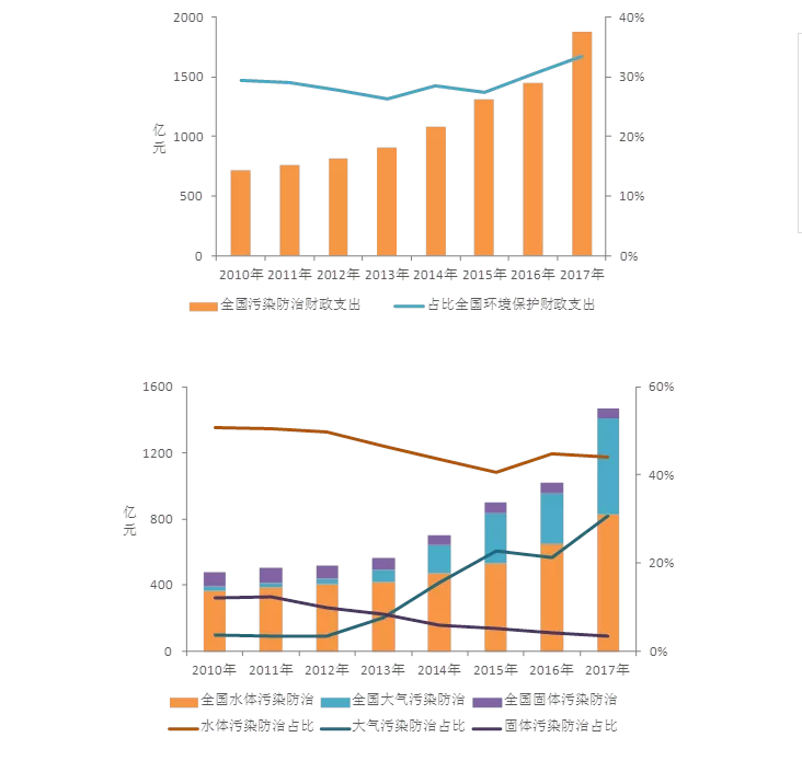 近兩年,全國污染防治公共預(yù)算支出占比全國環(huán)境保護公共預(yù)算支出在小幅提升。與水污染防治、大氣污染防治相比,全國固體廢物污染防治支出呈逐年持續(xù)下降趨勢;從2013年開始,大氣污染防治財政支出占比呈現(xiàn)劇烈增加;而水體污染防治支出從2010年-2015年不斷下降,受水十條等政策影響,2016年-2017年水污染防治財政支出占比逐漸回升。