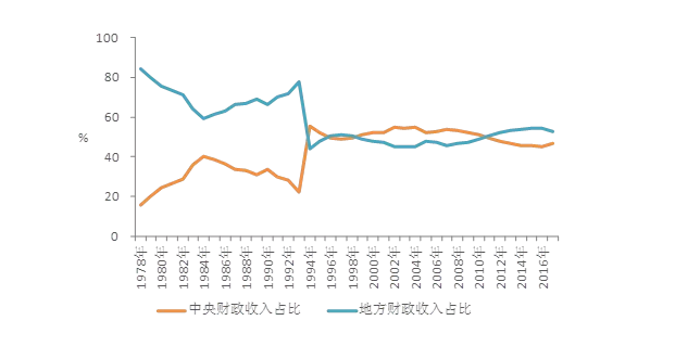 全國公共預(yù)算收入等于中央公共預(yù)算收入加地方公共預(yù)算本級收入。1994年分稅制改革前,一多半公共預(yù)算收入被地方占有,中央占比一直低于40%;中央占比全國的數(shù)字,1994年接近1978年,約20%左右。1994年分稅制改革后,中央與地方分別占比全國公共預(yù)算收入均在50%左右;在國家公共預(yù)算收入構(gòu)成中,中央與地方呈現(xiàn)分庭抗禮的局面。