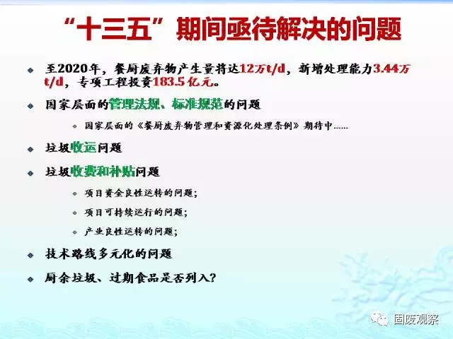 2017年1月下旬,國(guó)家發(fā)改委印發(fā)《戰(zhàn)略性新興產(chǎn)業(yè)重點(diǎn)產(chǎn)品和服務(wù)指導(dǎo)目錄》(2016版),將“餐廚廢棄物資源化無害化利用”的相關(guān)裝備和技術(shù)研發(fā),列入“資源循環(huán)利用產(chǎn)業(yè)”分項(xiàng)之一。將預(yù)示著“十三五”期間,餐廚垃圾市場(chǎng)又一次發(fā)展機(jī)遇。據(jù)任連海教授透露,國(guó)家層面的《餐廚廢棄物管理和資源化處理?xiàng)l例》已經(jīng)成文,餐廚垃圾處理市場(chǎng)運(yùn)營(yíng)機(jī)制也有望進(jìn)一步明朗。預(yù)計(jì)該條例的推出,對(duì)進(jìn)一步規(guī)范餐廚垃圾管理將起到至關(guān)重要的作用。在政策逐步完善的發(fā)展條件下,餐廚垃圾處理行業(yè)將迎來巨大發(fā)展空間,十三五期間,餐廚垃圾市場(chǎng)預(yù)計(jì)將達(dá)1500-2000億。