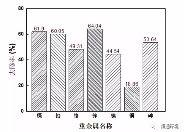 從圖表中可以明顯看出重金屬去除率多數(shù)達到50%以上,其中鎘和鋅去除率高達61.9%和64.04%。