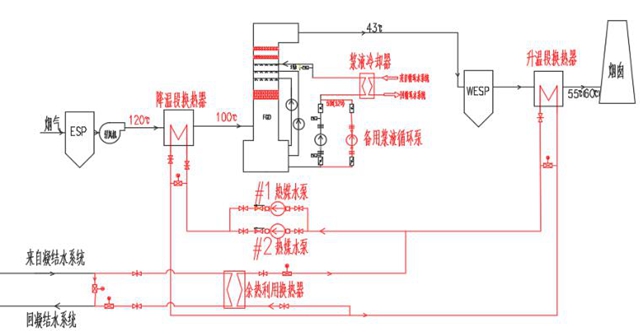本次技術改造由脫硫塔吸收系統、漿液(煙氣)冷卻系統和煙氣再熱系統組成。將脫硫吸收塔頂層即第 3 層噴淋層改造為低溫噴淋層,在其管路上設置漿液冷卻器,漿液溫度經過漿液冷卻器降至 43℃,冷卻介質采用 180t/h 的江水或循環(huán)冷卻水,脫硫吸收塔出口煙氣溫度由 50℃降至43℃,實現減少排濕量,實現減少煙羽形成的目的;增設煙氣升溫系統提升排煙溫度,該系統包括:升溫段煙氣換熱器、熱媒水循環(huán)系統、定壓補水系統。