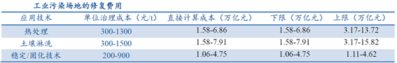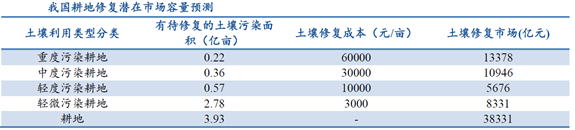 我國土壤污染類型包括農(nóng)業(yè)耕地土壤污染、城市工業(yè)用地土壤污染以及礦區(qū)土壤污染。目前,我國待修復(fù)的污染場地數(shù)量非常之多,保守估計超過50萬塊。其中,耕地土壤修復(fù)投資需求在3萬億以上,城市土壤修復(fù)投資需求1萬億以上,礦區(qū)土壤修復(fù)投資需求可達(dá)近2萬億。(備注:由于修復(fù)分為輕重緩急,分階段進行,而且受到資金的制約,所以預(yù)測的投資需求,和真正會去修復(fù)的地塊,不是同一個概念)