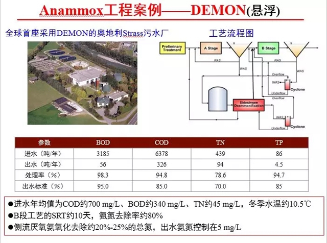 奧地利Strass污水處理廠是全球首座采用DEMON的污水廠。污泥消化液的厭氧氨氧化主要有兩個方面的核心技術:一是基于pH的DO實時控制短程硝化,另一個是基于物理分離技術實現雙泥齡,采用旋流分離器(DEMON1.0),后改進為微篩選擇器(DEMON2.0)。Strass污水廠目前在厭氧氨氧化做的非常成功,氨氮去除率約80%,總氮去除率20%-25%,出水氨氮控制在5mg/L以下。目前這種工藝在美國、德國、瑞士等也都做的非常好。