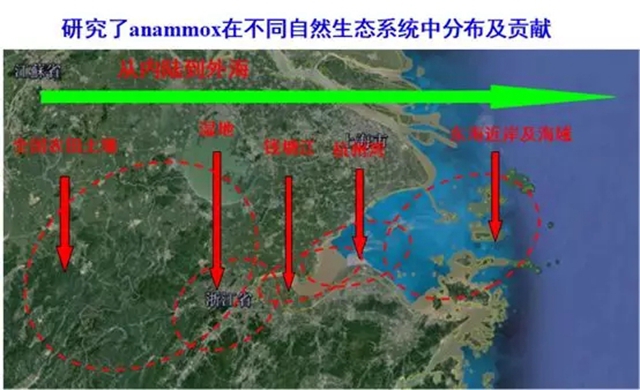 鄭平教授以前的學生--浙江大學胡寶蘭教授研究了Anammox細菌在中國不同自然生態(tài)系統(tǒng)中的分布及貢獻。她發(fā)現,Anammox細菌廣泛存在于不同的自然生境中,且沉積物的有機碳和無機氮是影響Anammox分布的主要因素。她還發(fā)現人類活動影響了Anammox菌的分布,甚至特定Anammox菌可作為人類活動的指示菌。