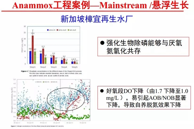 除了污泥消化液、工業(yè)廢水,近五年全球擴大了對Anammox在城市污水主流程中的應用。新加坡樟宜再生水廠是新加坡最大的再生水廠,也是國際上首個強化生物除磷與厭氧氨氧化在大型污水廠共存的案例。短污泥齡和適宜溶解氧是實現懸浮游離厭氧氨氧化菌生長的必要條件,在好氧區(qū)實現部分硝化和亞硝酸鹽積累,缺氧區(qū)進行厭氧氨氧化反應(脫氮貢獻率30%),整體工藝能耗降低10%-30%,池容減少10%-40%。新加坡公用事業(yè)局的科學家曹業(yè)始博士在該污水廠Anammox技術的設計和應用中發(fā)揮了重要作用。