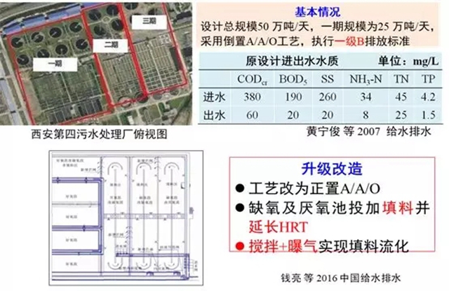 西安第四污水處理廠設計總規(guī)模50 萬噸/天,一期規(guī)模為25 萬噸/天,采用倒置A/A/O工藝,執(zhí)行一級B排放標準,后經升級,改造為正置A/A/O工藝,在缺氧及厭氧池投加填料并延長HRT,通過攪拌+曝氣實現填料流化,出水水質成功由一級B提升為一級A標準。