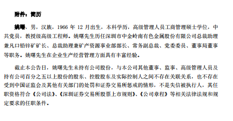 姚曙,男,漢族,1966年12月出生,本科學(xué)歷,高級(jí)管理人員工商管理碩士學(xué)位,中共黨員,教授級(jí)高級(jí)工程師。姚曙歷任深圳市中金嶺南有色金屬股份有限公司總裁助理兼凡口鉛鋅礦礦長、總裁助理兼礦產(chǎn)資源事業(yè)部部長、常務(wù)副總裁、黨委委員、董事局董事等職務(wù)。其在企業(yè)生產(chǎn)經(jīng)營管理方面具有豐富經(jīng)驗(yàn)。
