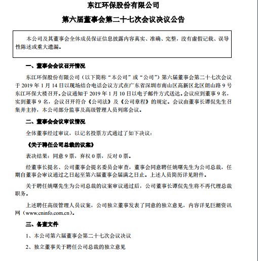 東江環(huán)保公告,經(jīng)董事長提名、公司董事會(huì)提名委員會(huì)審查,董事會(huì)同意聘任姚曙為公司總裁,任期自董事會(huì)審議通過之日起至第六屆董事會(huì)屆滿之日止。關(guān)于聘任姚曙為公司總裁的議案審議通過后,公司董事長譚侃將不再代理總裁職務(wù)。