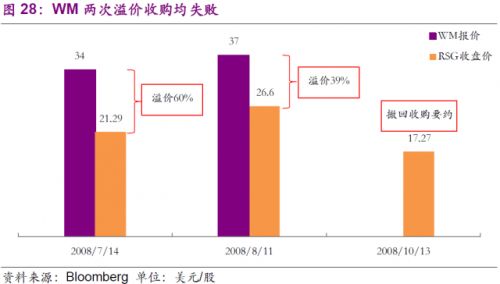 值得注意的是公司發(fā)起收購的時間。2008年6月23日,RSG宣布將與Allied Waste合并,而當(dāng)時Allied Waste和RSG分別是美國第二、第三大固廢公司。消息宣布后一個月內(nèi),WM就向RSG提出了收購要約,但未能實現(xiàn)。