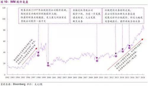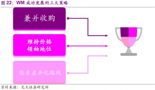 縱觀WM發(fā)展的歷史,它既享受到外部經(jīng)濟(jì)和行業(yè)高速發(fā)展所帶來的廣闊市場,也需經(jīng)歷經(jīng)濟(jì)危機和市場轉(zhuǎn)型所帶來的陣痛。公司為搶占市場份額,穩(wěn)固龍頭地位,實現(xiàn)股東最大化方面做出了多方面努力,制定了各類執(zhí)行策略以期達(dá)到目標(biāo),而我們認(rèn)為其中最重要的是三項策略,也是我們將進(jìn)一步細(xì)致分析的,即兼并收購,維持價格領(lǐng)袖地位,以及探索差異化路線。