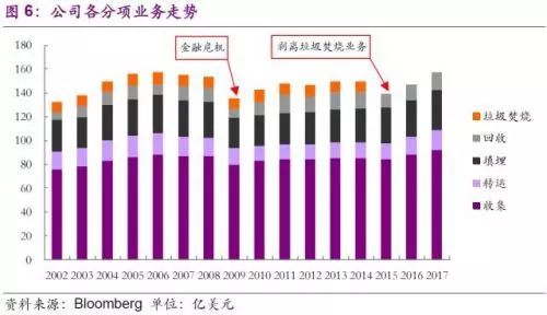 二是收購專業(yè)化的新生業(yè)務(wù)。 隨著固廢傳統(tǒng)市場業(yè)務(wù)趨于飽和,公司也在積極求變。一方面,公司利用自有團(tuán)隊積極研發(fā)已有業(yè)務(wù)的轉(zhuǎn)型,另一方面,公司先后在2009至2016年,通過多次收購成熟的專業(yè)化新生公司,拓展了醫(yī)廢、有機垃圾、建筑垃圾、電子回收等市場,并取得了一定成績。需要注意的是,公司的以上收購雖涉及不同細(xì)分領(lǐng)域,但核心觀念一致,即加大資源回收再利用,這也契合美國固廢市場的轉(zhuǎn)型,進(jìn)一步優(yōu)化完善固廢處理全產(chǎn)業(yè)鏈發(fā)展。