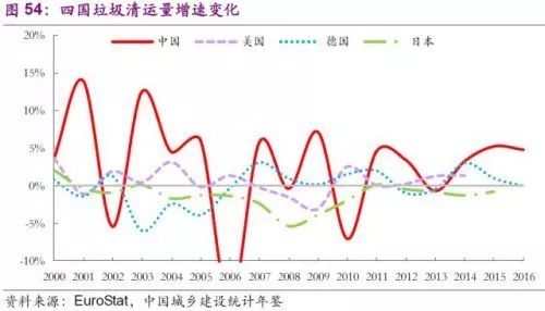 增速方面,美國近30年間雖持續(xù)增長,但復(fù)合年均增速不足1%;德國基本實現(xiàn)固廢0增長;日本更是從2000年起連年實現(xiàn)固廢負(fù)增長。中國近30年復(fù)合年均增速略超5%,近7年基本維持在4%左右。按照《“十三五”全國城鎮(zhèn)化生活垃圾無害化處理設(shè)施建設(shè)規(guī)劃》,預(yù)計到2020年中國垃圾清運量將達(dá)4億噸,未來4年年均增速有望持續(xù)超10%。