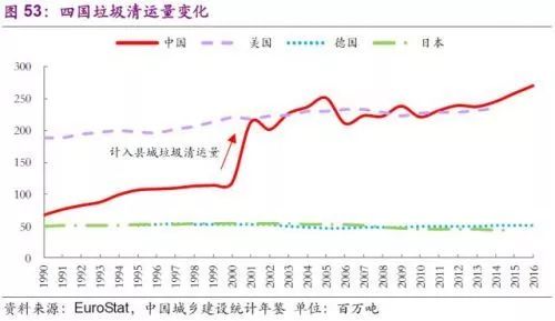 美國、日本、德國同為全球領(lǐng)先的發(fā)達(dá)國家,早在二十世紀(jì)90年代便實現(xiàn)了100%垃圾清運率,所以它們的垃圾產(chǎn)生量也是他們的垃圾清運量。美國垃圾清運量從二十世紀(jì)90年代起仍在持續(xù)增長,目前維持在2.3億噸左右;德國垃圾清運量偶有波動,基本維持在5千萬噸;日本垃圾清運量更是從1990年的5千萬噸減少到2015年的4千萬噸左右。中國垃圾清運量伴隨著經(jīng)濟(jì)高速發(fā)展,在2001年起計入縣城垃圾清運量后達(dá)到2億噸水平,總量和美國持平并在2012年實現(xiàn)超越,成為全球垃圾清運第一大國。