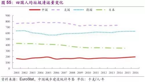 年度人均垃圾產(chǎn)生與清運量與經(jīng)濟(jì)發(fā)展水平正相關(guān)。美國常年保持在700千克/人?年以上,位居全球之首。德國稍次,近十年恢復(fù)到600千克/人?年水平。日本率先提出3R(減少原料、再利用、資源回收)的固廢處理標(biāo)準(zhǔn)并堅持執(zhí)行,近20年來人均垃圾清運量已減至300千克/人?年左右。中國雖然總垃圾清運量已位居全球第一,但人均垃圾清運量距其他三國尚有不小距離,隨著城鎮(zhèn)垃圾清運率的進(jìn)一步提升,以及農(nóng)村垃圾產(chǎn)生及清運量的進(jìn)一步提升,中國環(huán)衛(wèi)市場存在較大空間。