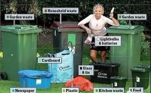在英國(guó),每家每戶都有至少3種顏色的帶滾輪垃圾桶,并且垃圾桶上還會(huì)有各家的門牌號(hào)碼。垃圾桶由Cherwell(相當(dāng)于中國(guó)的社區(qū)居委會(huì))統(tǒng)一制作,居民自行購(gòu)買。垃圾回收費(fèi)用為一年145鎊。每周回收的垃圾桶顏色不同,這周收綠桶,下周收藍(lán)色和褐色的桶。