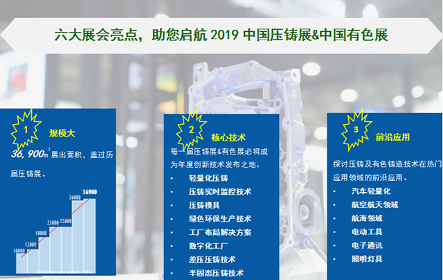 中國壓鑄展和中國有色展匯集壓鑄廠、有色鑄造廠及其設備、材料、配件和服務供應商,包括壓鑄機、低壓差壓機、周邊自動設備、熔煉設備、鑄件后處理設備及技術、壓鑄模具、原輔材料、檢測儀器、模擬軟件、快速成型等。
