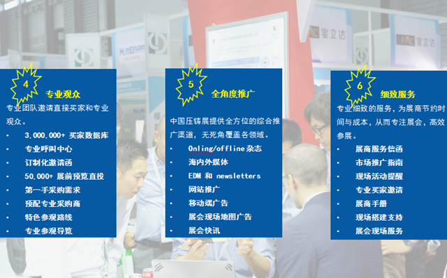 CHINA DIECASTING 2019中國壓鑄展和CHINA NONFERROUS 2019中國有色展是展商尋找重要客戶群體、建立全新業(yè)務聯(lián)系的理想平臺。2018年414家參展商中90%的展商確認他們在展會上找到了主要目標群體。2019年展會前期將有專業(yè)團隊,通過呼叫中心、訂制化邀請函、展前預覽直投等多渠道邀請重要買家和專業(yè)觀眾,設計特色參觀路線,提供專業(yè)參觀導覽,提高展商與采購的配對效率。