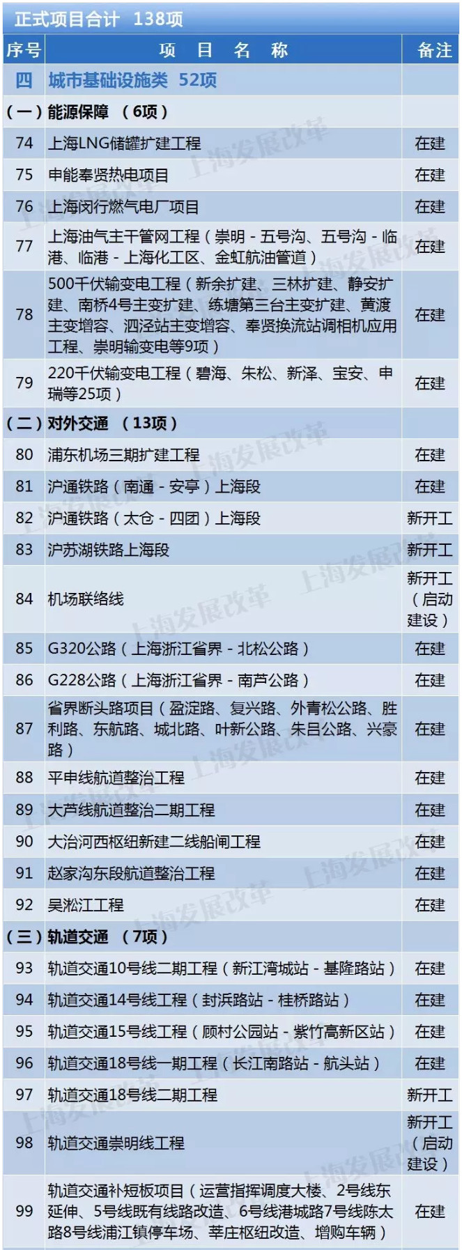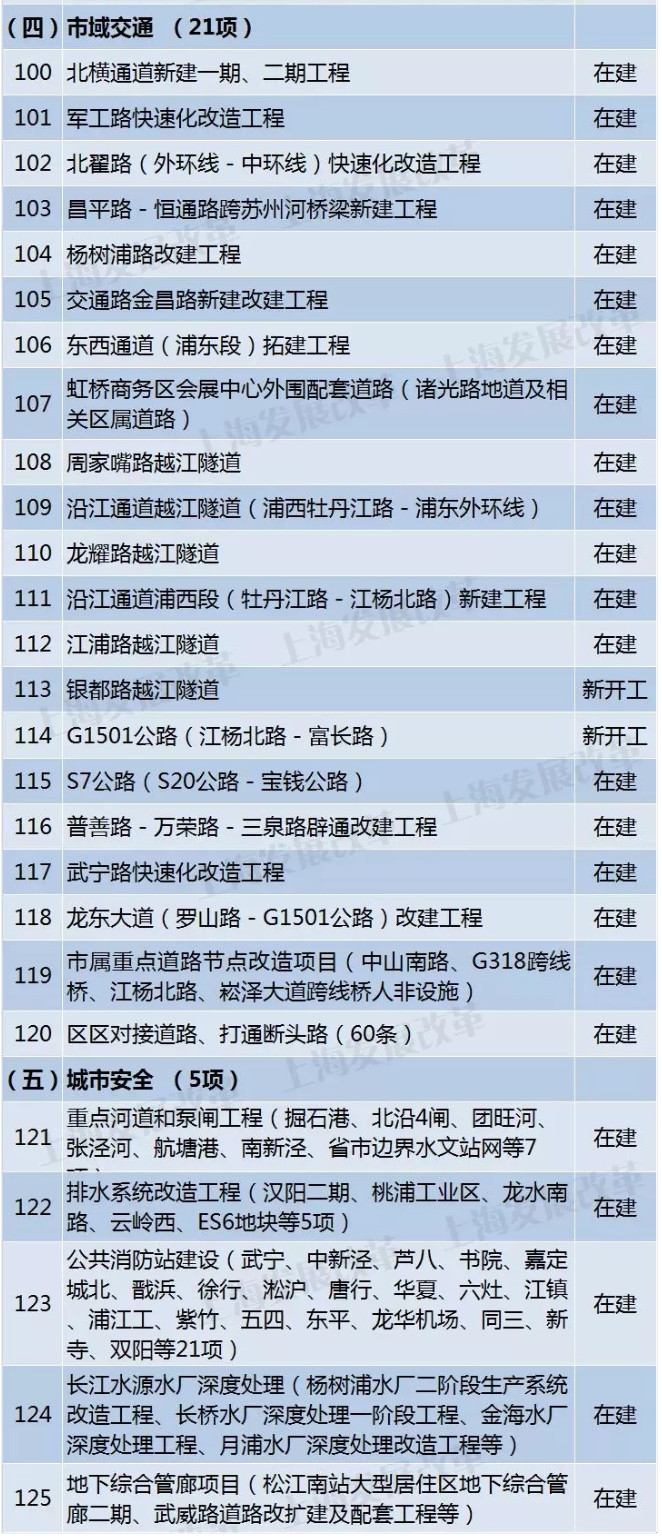 在建45項(xiàng)。包括:上海LNG儲(chǔ)罐擴(kuò)建工程、浦東機(jī)場(chǎng)三期擴(kuò)建工程、打通省界斷頭路、北橫通道、中心城區(qū)排水系統(tǒng)等。