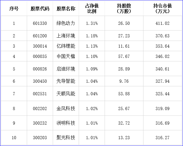 該基金的10大重倉持股包括綠色動力、上海環(huán)境、啟迪環(huán)境、中國天楹、聚光科技等行業(yè)龍頭,凈值占比、持股數(shù)量以及持倉市值,見下表: