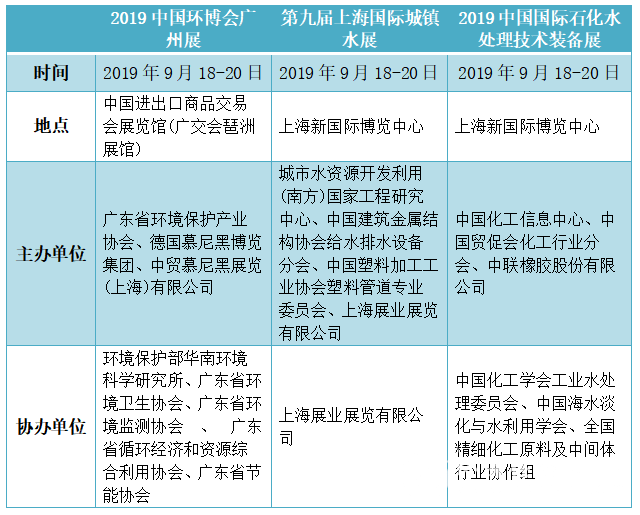 2019年9月18-20日,對于環(huán)保行業(yè)來說,這注定將是不平凡的一天,屆時,2019中國環(huán)博會廣州展、第九屆上海國際城鎮(zhèn)水展、2019中國國際石油和化工水處理技術(shù)及裝備展覽會都將在這一天隆重舉行,三場盛會聚焦環(huán)保不同領(lǐng)域,你是不是已經(jīng)眼花繚亂、不知所措了呢,別著急,小編來和你捋捋三場展會的區(qū)別與重點。