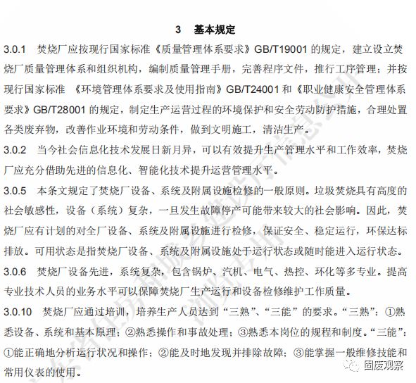 3.0.1 焚燒廠運(yùn)營(yíng)管理應(yīng)推行《質(zhì)量管理體系》GB/T 19001、《職業(yè)健康安全管理體系》 GB/T 28001 和《環(huán)境管理體系》GB/T 24001。
