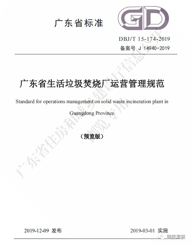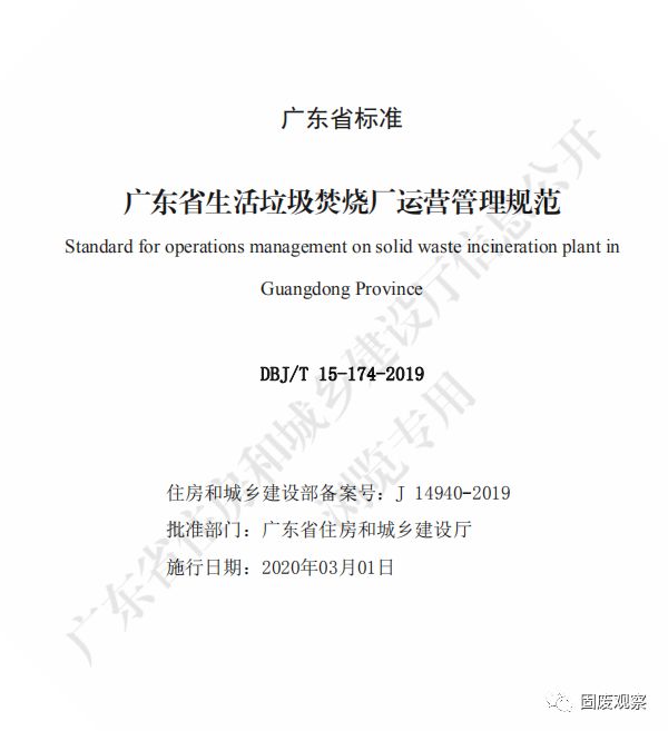 廣東省住房和城鄉(xiāng)建設(shè)廳關(guān)于發(fā)布廣東省標(biāo)準(zhǔn)《廣東 省生活垃圾焚燒廠運(yùn)營(yíng)管理規(guī)范》的公告 粵建公告〔2019〕82 號(hào) 經(jīng)組織專家委員會(huì)審查,現(xiàn)批準(zhǔn)《廣東省生活垃圾焚燒廠運(yùn)營(yíng)管理 規(guī)范》為廣東省地方標(biāo)準(zhǔn),編號(hào)為 DBJ/T 15-174-2019。
