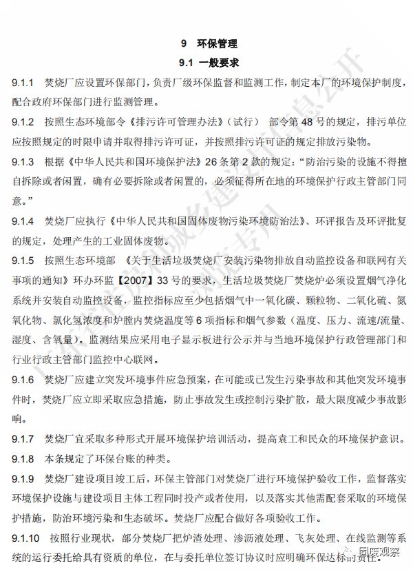 9.1.1 焚燒廠應(yīng)按有關(guān)規(guī)定建立環(huán)境保護(hù)責(zé)任制度,明確單位負(fù)責(zé)人和相關(guān)人員的責(zé)任, 配置專職環(huán)保管理人員。