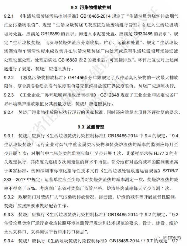 9.2.1 煙氣污染物的排放、飛灰與爐渣的處理、生活垃圾滲瀝液和車輛清洗廢水的處理 應(yīng)執(zhí)行環(huán)評(píng)批復(fù)及《生活垃圾焚燒污染控制標(biāo)準(zhǔn)》GB18485 的要求。