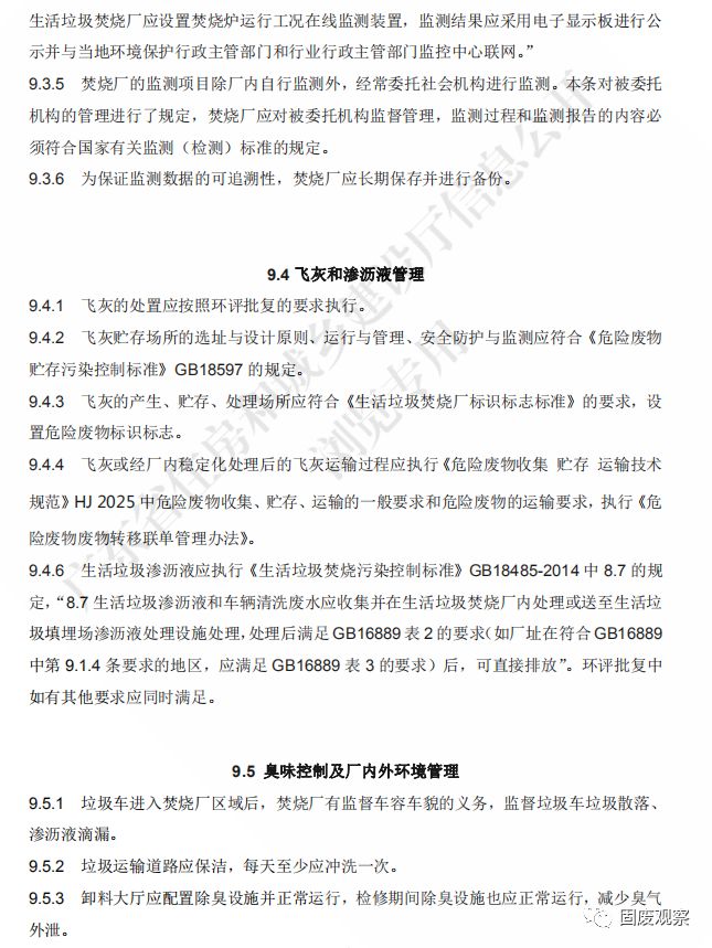 9.1.11 對(duì)焚燒廠內(nèi)產(chǎn)生的固體廢棄物的處理處置應(yīng)符合國(guó)家現(xiàn)行標(biāo)準(zhǔn)《固體廢物處理處 置工程技術(shù)導(dǎo)則》HJ2035 的有關(guān)規(guī)定。