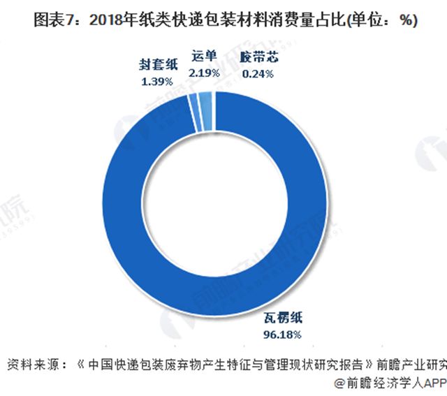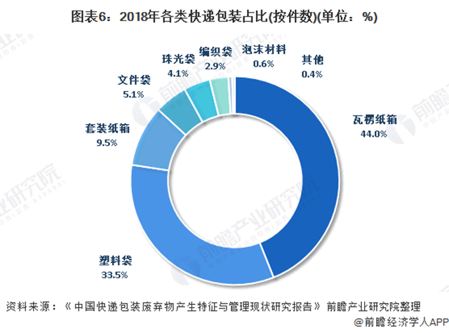 2019年,全國(guó)635.2億件快遞中,紙質(zhì)包裝快遞占比約為58.6%(按2018年占比,包含瓦楞紙箱、文件袋、套裝紙箱),塑料包裝快遞占比約為41.1%(包含塑料袋、珠光袋、編織袋、泡沫材料),其它類型占比0.4%。