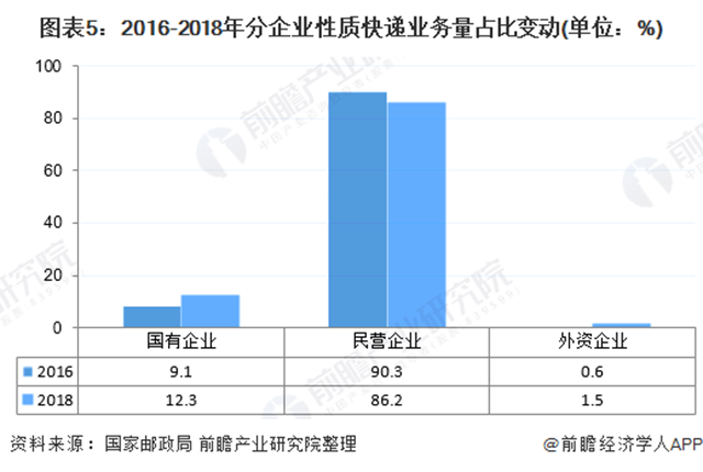 從企業(yè)性質(zhì)來(lái)看,近年來(lái)民營(yíng)企業(yè)快遞業(yè)務(wù)量占比有所下滑。2018年,民營(yíng)企業(yè)快遞業(yè)務(wù)量占總快遞量的86.2%,較2016年下降4.1個(gè)百分點(diǎn)。國(guó)有企業(yè)及外資企業(yè)快遞業(yè)務(wù)量占比有所上升。