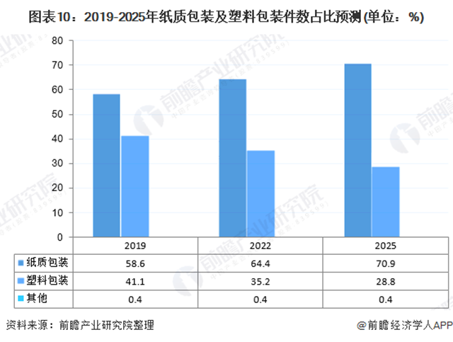 相對(duì)于2019年(按占比測(cè)算),受禁塑令影響將導(dǎo)致2025年紙質(zhì)包裝快遞潛在需求增加165.9億件,采用可降解塑料的塑料包裝快遞潛在需求增加388.5億件(2019年國(guó)內(nèi)塑料包裝快遞中采用可降解塑料比重遠(yuǎn)低于1%,忽略不計(jì))。