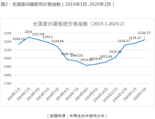 圖1:全國瓦楞紙平均價格走勢(2019年1月-2020年2月)