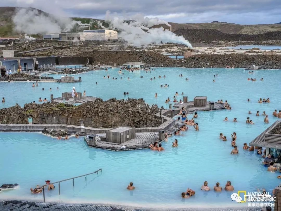 在冰島藍湖,地熱水源通過斯瓦森基發(fā)電廠產生電力后不再滾燙,被用來建立熱門旅游景點。水中高濃度的硅防止其下滲進熔巖原,并為湖水染上迷人的藍色。