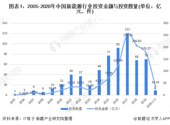 從新能源行業(yè)的投資規(guī)模來看,2005-2019年新能源行業(yè)投資金額呈現(xiàn)倒U型,2017年達(dá)到峰值254.25億元,2019年全年新能源行業(yè)的投資金額為176.27億元,同比下降14.78%,2020年1-3月中旬新能源行業(yè)的投資金額達(dá)到34.34億元。