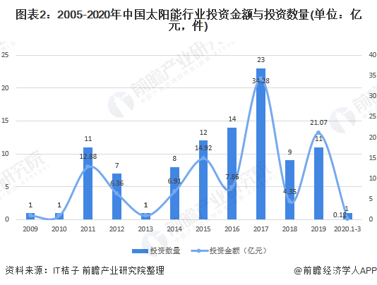 從太陽能行業(yè)的投資規(guī)模來看,2009-2019年新能源行業(yè)投資金額呈現(xiàn)波動(dòng)變化,2017年達(dá)到峰值34.28億元,2019年全年太陽能行業(yè)的投資金額為21.07億元,同比增長384.37%,2020年1-3月中旬太陽能行業(yè)的投資金額達(dá)到0.12億元。