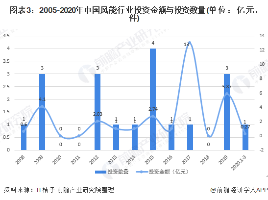 從風(fēng)能行業(yè)的投資規(guī)模來看,2005-2019年新能源行業(yè)投資金額波動(dòng)變化,2019年全年風(fēng)能行業(yè)的投資金額為5.87億元,2020年1-3月中旬風(fēng)能行業(yè)的投資金額達(dá)到0.27億元。