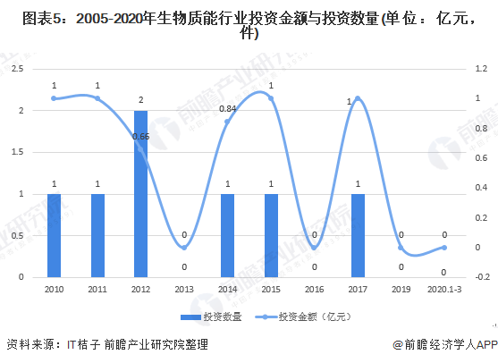 從生物質(zhì)能行業(yè)的投資規(guī)模來看,2017年投資規(guī)模1億元,2019年全年生物質(zhì)能行業(yè)的投資金額為0億元,2020年1-3月中旬新能源行業(yè)的投資金額達(dá)到0億元。