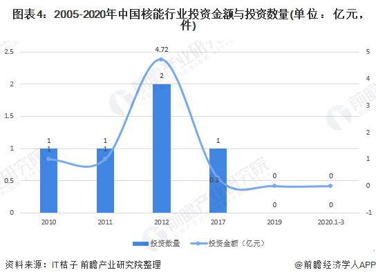從核能行業(yè)的投資規(guī)模來看,2005-2019年核能行業(yè)投資金額呈現(xiàn)倒U型,2017年融資金額0.3億元,2019年全年核能的投資金額為0億元,2020年1-3月中旬核能行業(yè)的投資金額達(dá)到0億元。