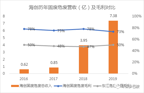 注:上述海創(chuàng)統(tǒng)計(jì)數(shù)據(jù)包含少量協(xié)同處置一般固廢業(yè)務(wù),但占比較小,例如2019年危廢處置營收6.16億,一般固廢收入1.22億。因此海創(chuàng)危廢毛利實(shí)際更高,例如2018年海創(chuàng)協(xié)同處置危廢的平均價(jià)格2260元/噸,遠(yuǎn)低于傳統(tǒng)焚燒及填埋處置費(fèi)用,危廢處置毛利率超80%。