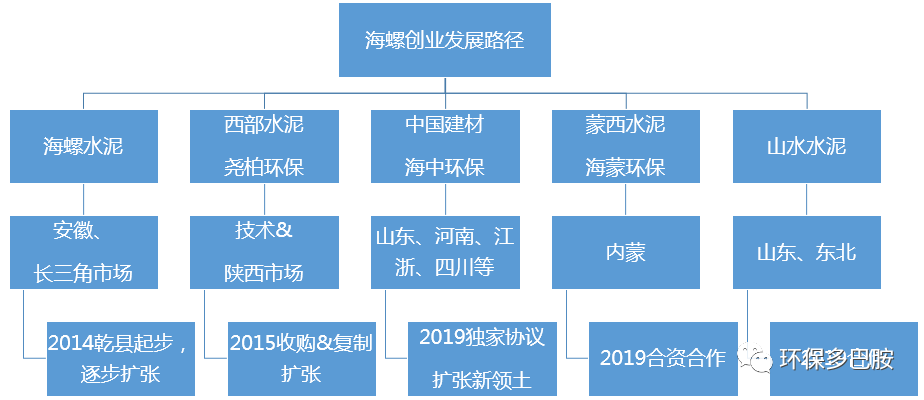 由于水泥行業(yè)市場格局較為固定,為了進(jìn)入海螺集團(tuán)影響力較小地區(qū)(海螺主要輻射安徽及長三角地區(qū)),則必須與其他水泥企業(yè)合作。2019年伴隨海創(chuàng)在水泥窯協(xié)同方面技術(shù)的成熟與管理的優(yōu)勢(shì),公司有了將潛在對(duì)手變成合作伙伴的資本,從而開啟全國異地?cái)U(kuò)張節(jié)奏!
