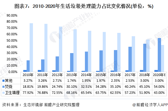 以生活垃圾為例。對生活垃圾的具體處理式有許多種,其中最常見的分別是衛(wèi)生填埋、焚燒和其他方式。目前,我國以衛(wèi)生填埋的應(yīng)用最廣,所占收運(yùn)量的比例也最高;焚燒則通常限定在沿海地區(qū)。根據(jù)“十三五”規(guī)劃,到2020年,我國生活垃圾處理方式中,焚燒處理將成為大頭,占比將達(dá)54%。