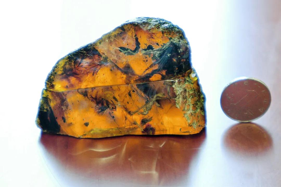 琥珀里的鳥化石,鳥足清晰可見 | 琥珀是古代天然樹脂轉(zhuǎn)化形成的寶石。這塊琥珀標(biāo)本產(chǎn)自緬甸,形成于大約9900萬年前的白堊紀(jì)中晚期,里面包裹著一只幾乎完整的雛鳥,極為罕見。圖源@VCG