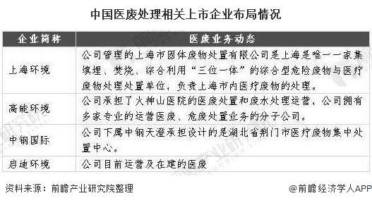 目前我國(guó)醫(yī)廢領(lǐng)域布局的企業(yè)較少,暫未形成激烈競(jìng)爭(zhēng)的局面,相關(guān)的上市公司有上海環(huán)境、高能環(huán)境、中鋼國(guó)際、啟迪環(huán)境等。以下是4家與疫情期間醫(yī)廢處理相關(guān)的上市公司的布局情況: