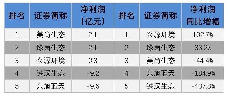 2019年環(huán)境修復(fù)A股環(huán)保上市公司凈利潤及其同比增幅排名: