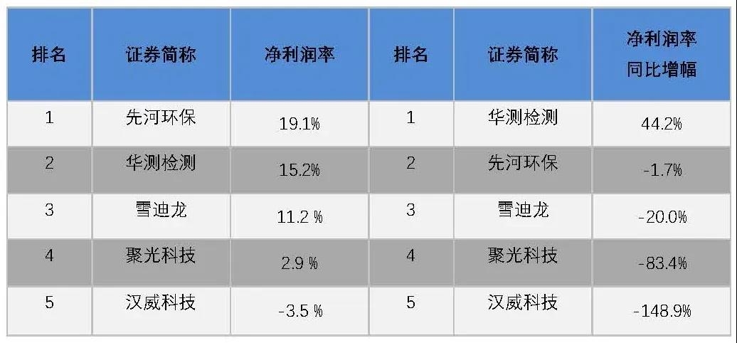 2019年環(huán)境監(jiān)測與檢測A股環(huán)保上市公司凈利潤率及其同比增幅排名: